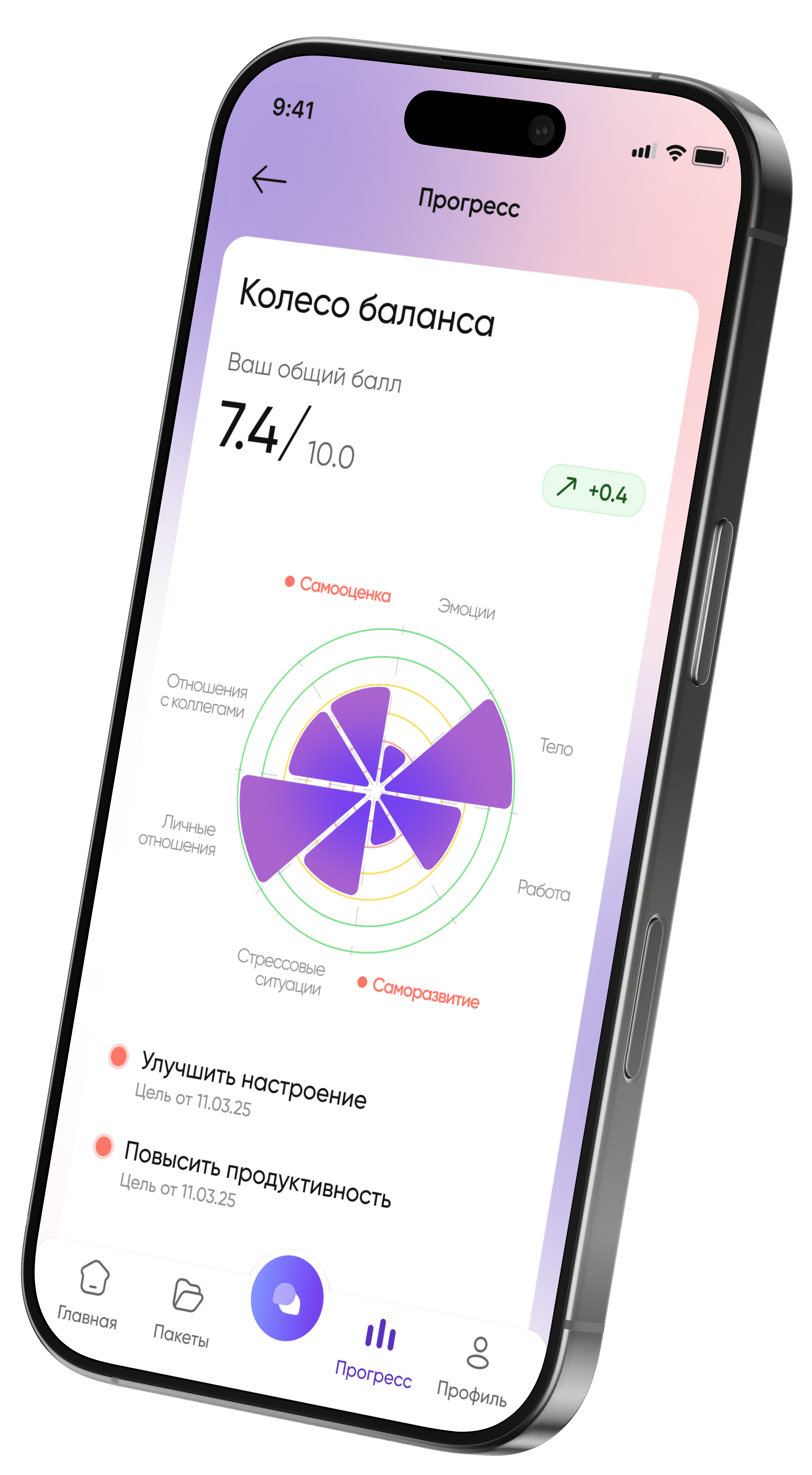 Наглядный анализ динамики на пути к вашим целям. Удобная система наблюдения за выполненными практиками, их объемом и личным ростом в каждом сегменте колеса баланса.